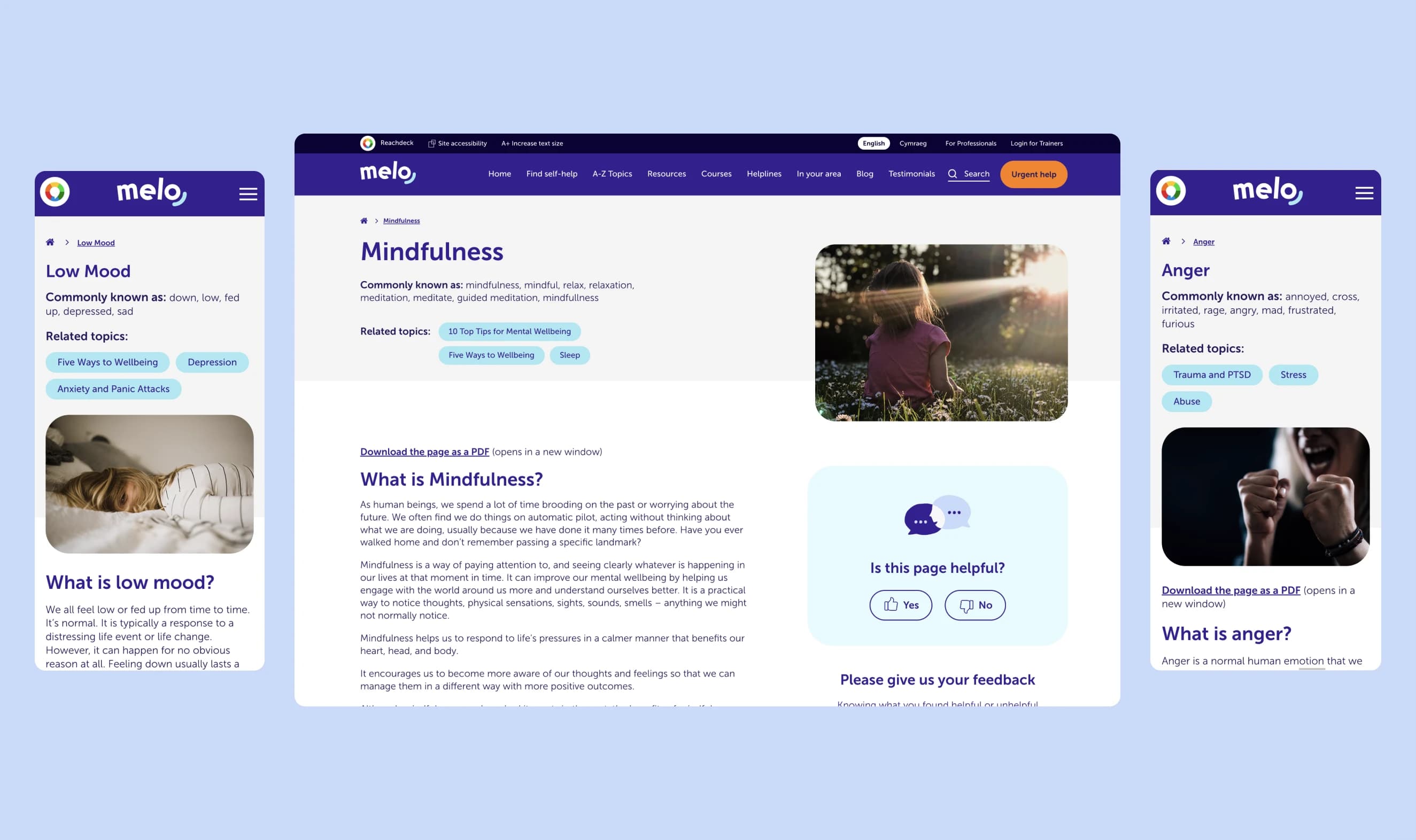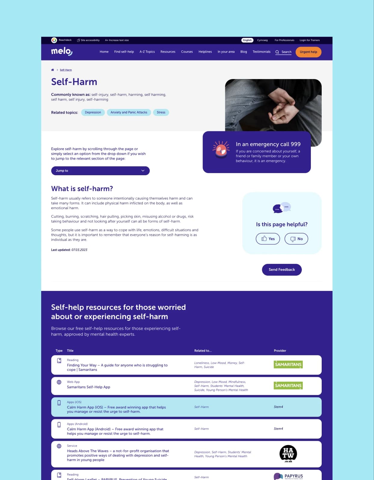 Melo came to fruition at the end of 2020, a much needed port of mental wellbeing self-help and support services. From resources to courses, the Melo website guides users to finding helpful content to improve their mental wellbeing.